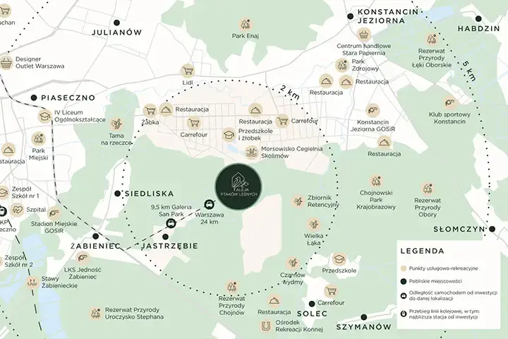 Aleja Ptaków Leśnych to nowoczesne, kameralne osiedle domów, powstające w zaciszu Chojnowskiego Parku Krajobrazowego. Zielone otoczenie zapewnia przestrzeń do wypoczynku i rekreacji, a bliskość Konstancina-Jeziorna to gwarancja dostępu do wysokiej jakości usług